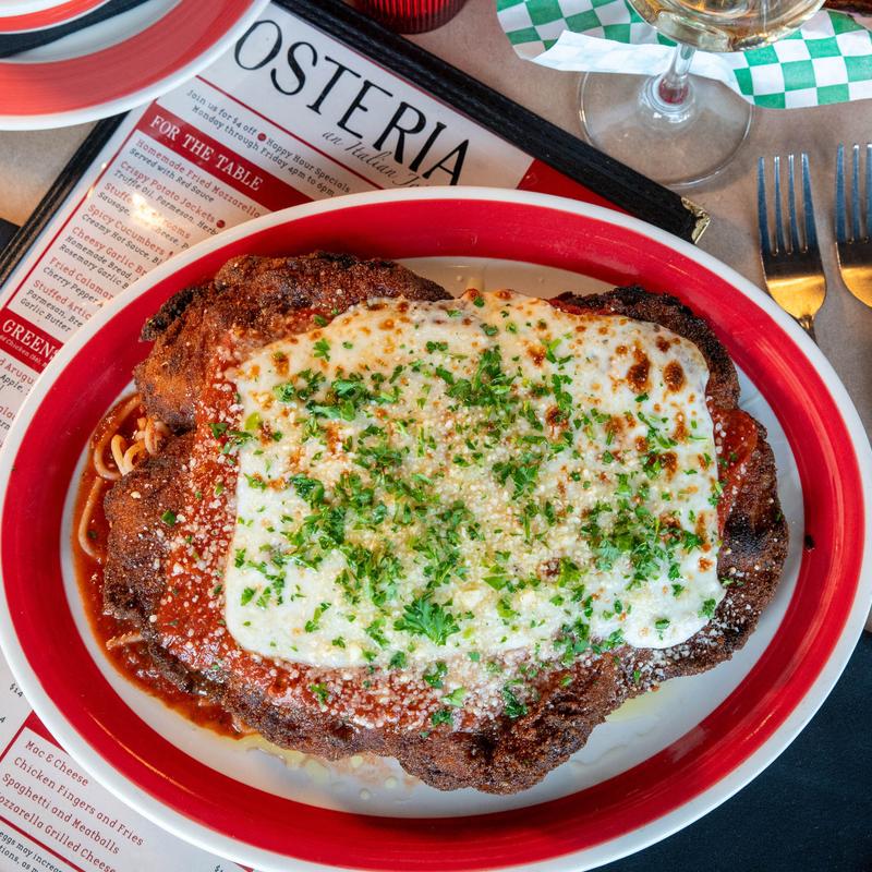 Chicken cutlet, mozzarella, red sauce, arugula, and pesto.