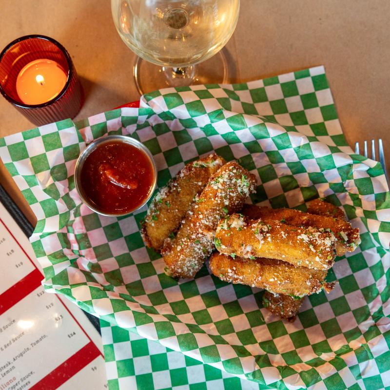 Homemade bread, mozzarella, rosemary garlic butter, and red sauce.