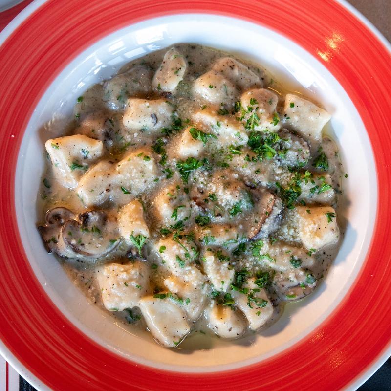 Crispy potato skins with truffle mushroom gravy, Italian sausage, scrambled egg, and parmesan.