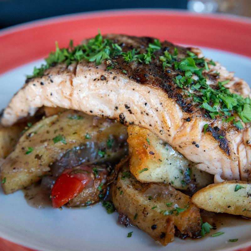 Tomato, olive & caper sauce, and fried rosemary potatoes.