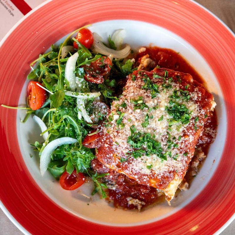 Beef, Italian sausage, mozzarella, red sauce, parmesan cream, and arugula salad.