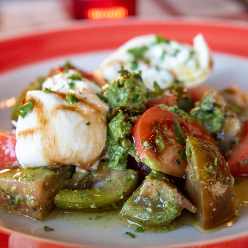 Warm bacon tomato jam, creamy burrata, & arugula on a toasted baguette.