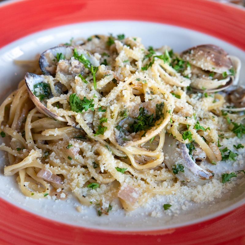 Linguine pasta with bacon lardons, parmesan, and soft poached egg.